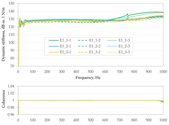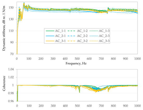 Figure 5 and Figure 6 summarizes results from the second stage of testing for samples made from E1 and AC bituminous mixtures. Each of the Figures presents the results of nine measurements. The upper graph shows averaged dynamic stiffness from over 250 spectra and is expressed in N/m on the dB/Level scale. The bottom graph shows the coherence between the excitation force and the recorded response (the ratio of the square of the magnitude of the cross-power spectrum between the excitation force (input) and the motion response of the structure (output), divided by the product of the input power spectrum times the output power spectrum [23]). In Figure 5 and Figure 6, it is presented linearly in the range from 0.96 to 1.04.