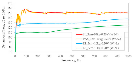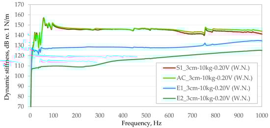 As can be seen in Figure 7 and Figure 8, the dynamic stiffness values obtained are not constant in the frequency band analysed in this article. For samples with lower stiffness, an upward trend in dynamic stiffness is visible with increasing frequency (E2 and E1). For example, in the case of the E2 bituminous mixture, dynamic stiffness in the range from 10 Hz to 1000 Hz increases non-linearly from 107.2 dB re. 1 N/m up to 125.3 dB re. 1 N/m. In the case of much more rigid bituminous samples (S1, PA8 and AC), except for the initial frequency band (from about 10 Hz to about 100 Hz), dynamic stiffness does not show a significant dependence on the frequency of generated vibrations.