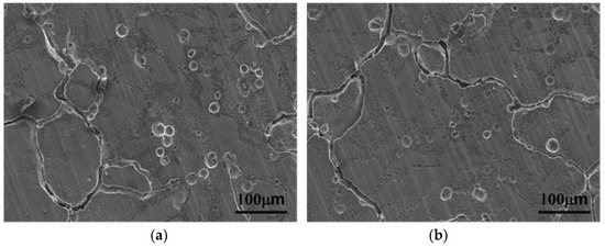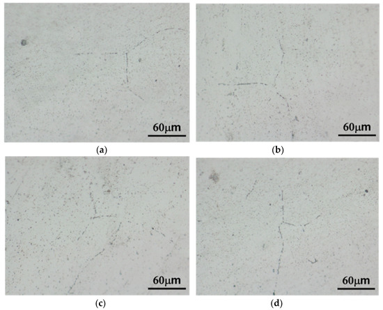 Materials with mass loss less than 15 mg cm−2 are considered resistant to intergranular corrosion. In the present work, the mass loss of all the homogenized alloys (about 3 mg cm−2) was much lower than 15 mg cm−2, indicating that the type of corrosion was resistant to intergranular corrosion. This is because the β and η phases at grain boundary were dissolved during homogenization. Homogenization treatment led to the absence of these β and η phases at grain boundary, which could prevent intergranular corrosion.
