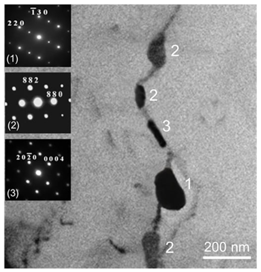 TEM specimen: The specimen was mechanically ground to 50 μm in thickness and then thinned by twin-jet electro-polishing with a solution (30 vol% nitric acid + 70 vol% methanol) at −25 °C and 12 V.