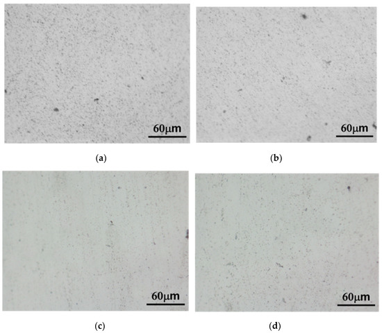 Tensile testing was carried out at a strain rate of 1.3 × 10−3 s−1 according to ASTM B557M-10 [25]. Three tensile specimens were tested, and the average value was calculated.