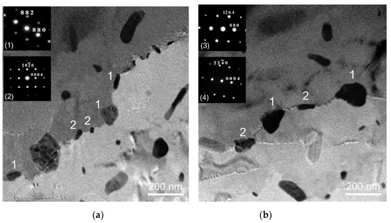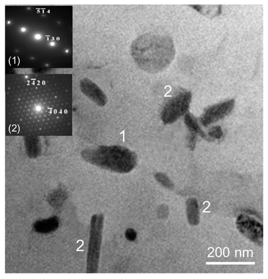 TEM photomicrograph of alloy D after homogenization treatment (1: MnAl6, 2: MnAl4).