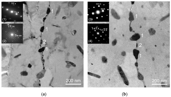 TEM photomicrographs of alloy D (a) homogenization and furnace cooling (b) homogenization, furnace cooling and sensitization (1: Mg2Al3, 2: MgZn2).
