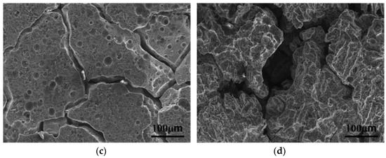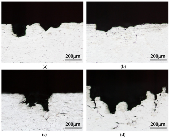 Figure 10 shows the surface of sensitized alloys after ASTM G67 mass loss test. The pitting corrosion and slight intergranular corrosion could be found in the sensitized alloys A and B. The sensitized alloys C and D had significant intergranular corrosion, especially the sensitized alloy D. Figure 11 shows the transverse surface of sensitized alloys after ASTM G67 mass loss test. The transverse surface also shows that the corrosion of alloys C and D was more severe than that of the alloys A and B.