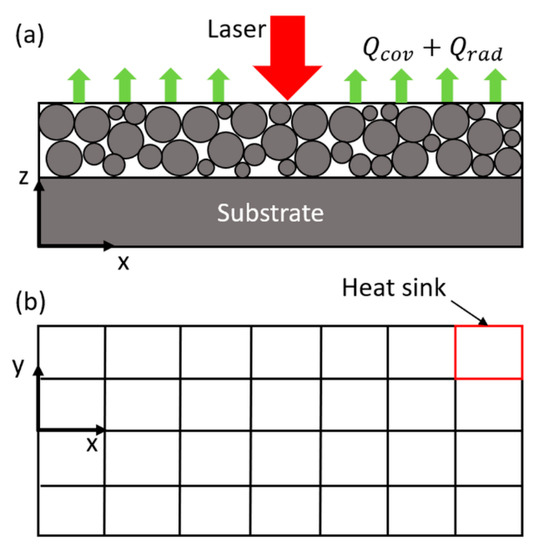 (a) Schematic drawing of the heat transfer mechanism in PBMAM. The red arrow represents heat input from the laser moving along positive x-direction. The green arrows represent the heat loss due to convection and radiation from the upper boundary of the powder layer. (b) The upper boundary of the powder layer is mathematically discretized into multiple sections (red box) due to the non-uniform temperatures and non-uniform heat loss at the boundary [34].