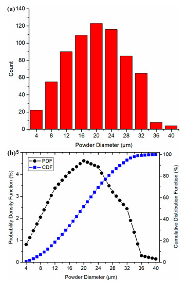 The powder size distribution of AlSi10Mg powders in this study. (a) Powder counts at the given powder size, and (b) probability density function (PDF) and cumulative distribution function (CDF) of the powder size distribution.