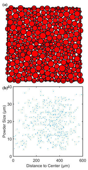 Predicted powder packing structure of ALSi10Mg in this study. (a) Packing structure of 500 powders, and (b) powder size and center location of 500 packed powders.