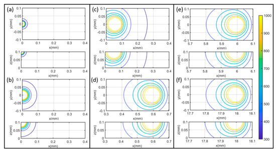 Temperature profiles during a single-track scan of PBMAM with P = 180 W, V = 600 mm/s at (a) 0.001 ms (b) 0.01 ms (c) 0.1 ms (d) 1 ms (e) 10 ms (f) 30 ms. It should be noted that the color bar is corresponding to the temperature contour value in Kelvin. The temperature plots on x-y planes are the temperature profiles at the top boundary; the temperature plots on x-z planes are the temperature profiles at the cross-sectional area along the laser scanning direction. Laser scanning direction is along positive x-direction at y = 0 mm.
