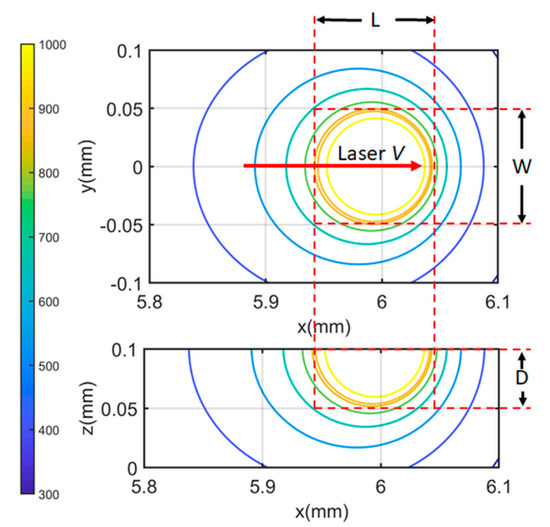 Molten pool length (L), molten pool width (W) and molten pool depth (D) calculated from the predicted temperature profile at the top boundary (x-y plane) and the predicted temperature profile at the cross-sectional area (x-z plane) at the laser scan direction along positive x-direction at y = 0 mm.