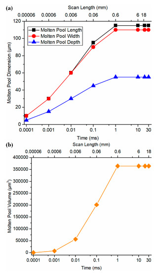 Molten pool growth and stabilization during the single-track scan of SLM of AlSi10Mg with P = 180W, V = 600 mm/s. (a) Molten pool length, width, and depth, and (b) molten pool volume.