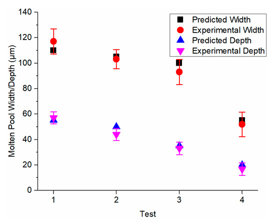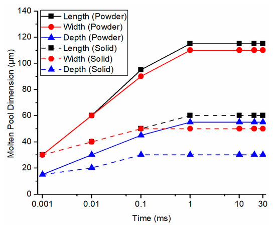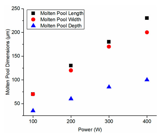 For comparison, the molten pool evolution was also predicted by the developed model in the authors’ previous work [27], which used the solid bulk materials properties without considering the heat loss at the part boundary. As shown in Figure 8, the time for molten pool stabilization using the developed model in the previous work and the presented model has no pronounced difference. However, the stabilized molten pool dimensions using the presented model were significantly larger than those using the previous model because the solid thermal conductivity is significantly higher than powder thermal conductivity without introducing the voids with high thermal resistance. High thermal conductivity materials require larger laser power for the SLM process because the energy can be more easily dissipated into the surrounding area, which prevents the material melting and the formation of the molten pool. To investigate the prediction accuracy, the stabilized molten pool dimensions from the prediction using the presented model were validated to the documented experimental values in the literature [43]. Close agreements were observed between predictions and experimental values as shown in Figure 9. Other associated data including molten pool length and computational time is given in Table 4. The calculation was carried out by MATLAB program on a personal computer running at 2.8 GHz. The calculated region has dimensions of 0.4 mm in length, 0.2 mm in width, and 0.1 mm in depth with the increment of 5 μm in each direction in the absolute coordinate. The average computational time was 217.93 s. In addition, the higher the laser scanning speed, the smaller the molten pool dimensions, and vice versa. This observed trend was confirmed with the experimental measurements. Moreover, the molten pool dimensions were also predicted using the presented model with various laser power setting as illustrated in Figure 10. The higher the laser power, the larger the molten pool size, and vice versa. This observation was confirmed by instinctive trend and further prove the predictive capability of the presented model.