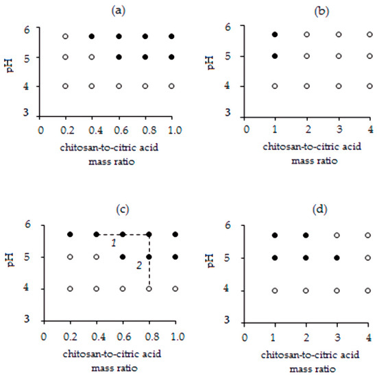 The effect of the chitosan-to-citric acid mass ratio and of pH of the polymer stock solution on the formation of the chitosan–citric acid complex at 20 °C (a,b) and 60 °C (c,d). Filled symbols (●) denote phase-separated systems, and open symbols (○) denote homogeneous systems.