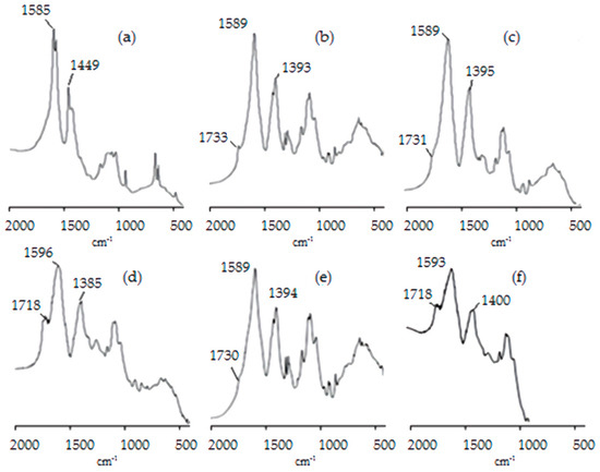 The FT-IR spectra of the cross-linked samples (Figure 2b–f) presented two new characteristic peaks at ~1730 cm−1 attributed to the C=O stretching vibrations of the carboxylic moiety and at ~1390 cm−1 attributed to symmetric stretching vibrations of the carboxylate ion. Both new bands are indicative of the presence of citrate within the chitosan matrix, providing support of the ionic interaction between the positively charged protonated amine groups of chitosan and the negatively charged carboxylate ions of the citric acid [26].