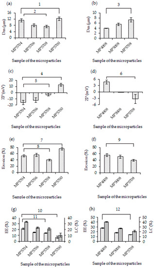 Dm (a,b), zeta potential (ZP) (c,d), erosion (e,f), encapsulation efficiency (EE), and loading capacity (LC) (g,h) for the non-cross-linked and cross-linked chitosan microparticles prepared at different polymer-to-crosslinker ratios (a,c,e,g) and pH values (b,d,f,h). The p-values (1—8.48 × 10−4; 2—5.26 × 10−3; 3—1.14 × 10−3; 4—2.1 × 10−7; 5—2.72 × 10−3; 6—2.13 × 10−3; 7—1.59 × 10−7; 8—1.33 × 10−3; 9—4,15 × 10−3; 10—6.92 × 10−6; 11—9.83 × 10−5; 12—4.78 × 10−7) were obtained from the one-way analysis of variance (ANOVA).