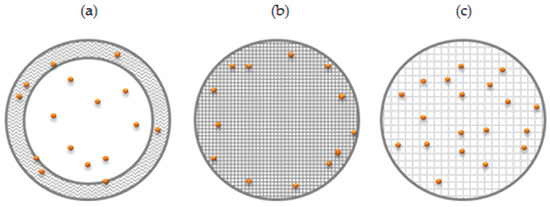 Schematic representation of proposed microparticle structures and BSA (orange dots) loading patterns: microparticles with core–shell structure (a), microparticles possessing a high degree of cross-linking of the polymer matrix (b), and microparticles possessing a lower degree of cross-linking of the polymer matrix (c).