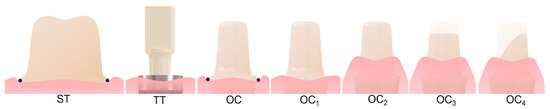 Schematic illustration of the investigation groups. ST, single-tooth preparation; TT, one-piece titanium implant with a scan body; OC, one-piece ZrO2 implant; OC1, OC for matching with reconstruction support; OC2, simulated subgingival insertion of 1.5 mm; OC3, additional occlusal reduction of 1 mm; OC4, additional lateral reduction of 45°.