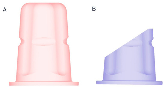 (A) Reconstruction tool for unmodified implants (OC1,2); (B) reconstruction tool for intraorally adjusted (OC3,4) implants.