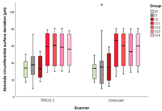 For each of the seven groups (OC, OC1–4, ST, and TT), 13 digital impressions with two scanners each (TRIOS 3 and Omnicam) were performed, resulting in 182 datasets in total. The descriptive statistics of the absolute circumferential and marginal deviations are presented in Table 1. Figure 4 and Figure 5 present the results for the lateral and marginal deviations visualized as box and whisker plots. MANOVA revealed significant differences between the study groups for both circumferential (p < 0.001) and marginal deviations (p < 0.001).