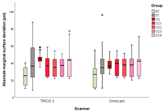 The digital impressions using TRIOS 3 showed that, of the tested groups, ST had the smallest deviation from the reference, with 24 ± 10 µm (Figure 5). These scans were significantly more accurate than for TT (40 ± 20 µm; p < 0.001) and OC (45 ± 6 µm; p < 0.001). Furthermore, compared to OC, all of the reconstructed groups (OC1–4) showed decreased mean marginal deviation values, between 35 ± 10 µm (OC3) and 38 ± 15 µm (OC4), and no significant differences between the groups were found, independent of the extent of the reconstruction (p > 0.979). The digitized data obtained with Omnicam showed similar results compared to TRIOS 3. In fact, significantly lower deviations were found for ST (26 ± 12 µm) compared to TT (41 ± 24 µm; p < 0.001) and OC (38 ± 6 µm; P < 0.007). In addition, the reconstructed implants (OC1–4) showed mean marginal deviations ranging between a minimum of 36 ± 10 µm (OC1) and a maximum of 37 ± 12 µm (OC4). No statistically significant differences between OC1–4 were found (p < 0.999). Finally, scan accuracy was not affected by the IOS used, except for OC (p < 0.001) which showed a lower deviation with Omnicam.