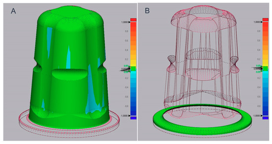 Representative measurements of OC2 with a tolerance of ±50 µm (green regions) for (A) circumferential deviations and (B) marginal deviations.