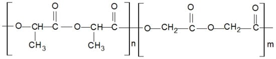 Two series of experimental tests of poly(lactic-co-glycolic acid) (PLGA) and PLLA blend bioresorbable polymers were performed to quantify the mechanical response of the material. The considered material was originally developed at the Centre of Polymer and Carbon Materials (CPCM) of the Institute of the Polish Academy of Sciences [25,26]. It is a copolymer of lactic acid and glycolic acid (the chemical formula is presented in Figure 1, while the basic physical-chemical properties, based on data provided by CPCM, are presented in Table 1) [27].