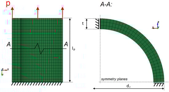 Model discretization was based on 8-node elements formulated as fully integrated solids. The quantity of elements was equal to 72,000 (finite element characteristic dimensions; the mesh density was determined in mesh sensitivity studies for more complex models; see Section 2.3.2).