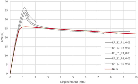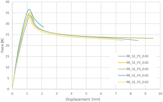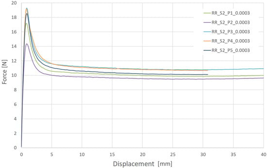 The investigated material behavior was similar to that of ductile materials, especially other thermoplastic polymers. Elastic behavior with a relatively stable (constant) elastic stiffness (elastic modulus) was clearly visible at small elongation values. With further elongation, a decrease in force was observed around the yield, as found in other thermoplastic polymers. However, the scale of the phenomenon was especially significant in the investigated case (the force decrease range was 35–50% in relation to the peak value). After force stabilization, relatively stable plastic-deformation behavior was observed until break. During this phase, the measured force remained approximately unchanged, suggesting limited hardening of the material (considering the necking of specimens).