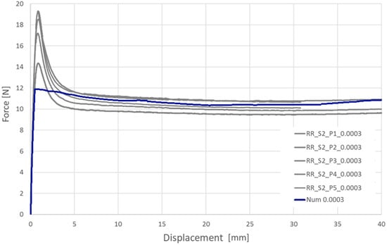 The proposed constitutive modeling approach for the bioresorbable polymer is based on an isotropic elastic-visco-plastic model (Cowper-Symonds). Validation of the methodology based on two separate experimental tests confirmed strain rate dependency (Figure 11) and a plasticity model with hardening, key mechanisms of PLGA behavior. For all considered variants, the obtained force results (Figure 12) showed an acceptable correlation between the numerical and experimental curves, proving the accuracy of the adopted approach.