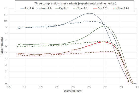 Comparison of experimental and numerical results for radial forces during free compression of undeformed coronary stents made of PLGA bioresorbable polymer with three compression rate variants: 1.0 mm/s, 0.1 mm/s, and 0.01 mm/s.