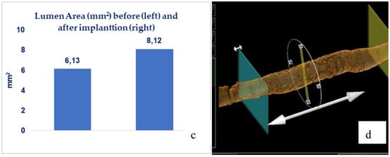 Acute outcome after PLGA/PLLA blend polymer stent implantation in coronary angiography (a) and optical coherence tomography (b). Lumen area increase before and after implantation (c). Geometrical view of vessel after stent implantation (d).