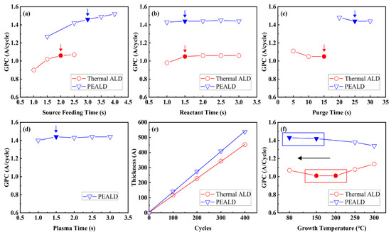 (a–d) GPC values of HfO2 deposited at 80 °C by thermal ALD and PEALD as functions of precursor exposure time, reactant exposure time, purge time and plasma exposure time. (e) Thickness values as a function of ALD cycles with thermal ALD and PEALD. (f) ALD windows as functions of deposition temperature with thermal ALD (150–200 °C) and PEALD (80–150 °C).