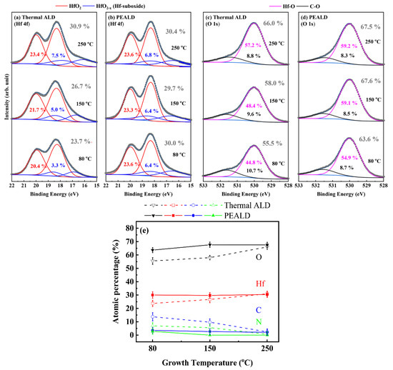 The deconvoluted Hf 4f spectra show the doublet of peaks at binding energy of 18.31 and 19.99 eV, which is associated with HfO2 [33]. Moreover, at binding energy lower than those of the 4f doublet, the suboxide peaks are located at 16.93 and 18.63 eV, and they are associated with HfO2−x. The atomic concentration of hafnium in HfO2 thin film deposited at a low temperature by thermal ALD was the lowest at 23.7%, because many defects, such as carbon, nitrogen and hydroxyl groups (−OH), were located in the HfO2 thin films. Conversely, the atomic concentration of hafnium in HfO2 deposited at 80 °C by PEALD was high, at 30.0%, due to the low level of contaminants, similar to the sample deposited at 250 °C by thermal ALD. Figure 3c,d shows the XPS results for O 1 s after thermal ALD and PEALD. O 1 s peaks are deconvoluted into two components, a signal associated with HfO2 at 530.03 eV and an additional peak associated with carbon and oxygen at 531.68 eV [33]. The C–O peaks represent impurity carbon defects combined with oxygen, which can reduce the performance and efficiency of electronic devices [34,35]. According to these results, as the deposition temperature increased from 80 to 250 °C in both the thermal ALD and PEALD processes, the ratio of the C–O peaks showed a tendency to decrease. Furthermore, in the PEALD process, the ratio of C–O peaks was reduced compared with thermal ALD at all temperatures. In particular, at 80 °C in PEALD, C–O peaks decreased more than at 250 °C in thermal ALD. The atomic concentration of oxygen in HfO2 was similar, except for the thin film deposited at a low temperature by thermal ALD. As mentioned previously for elemental Hf, the presence of many contaminants can lower the atomic concentration of oxygen in thin films.