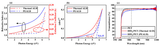 (a) Refractive index (n), extinction coefficient (k) and (b) optical bandgap values extracted using the Tauc method for HfO2 films (50 nm) formed at 80 °C, using thermal ALD and PEALD, as measured by ellipsometry. (c) Transmittance of HfO2 thin films (50 nm) deposited at 80 °C by thermal ALD and PEALD on PET substrate.