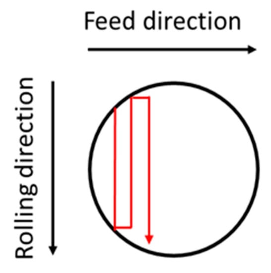 Scheme of the meandering pattern used for deep rolling and microblasting with indication of the feed and the rolling direction.