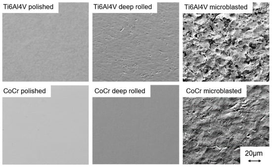 Scanning electron microscope images of the polished, deep-rolled and microblasted Ti6Al4V and CoCrMo (CoCr) samples.