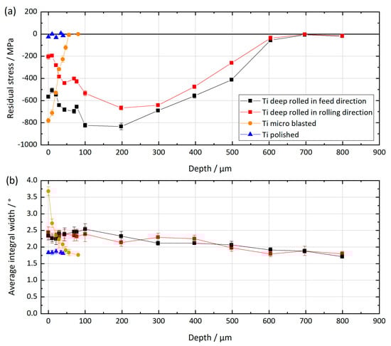 The residual stress depth distributions for the Ti6Al4V samples are presented in Figure 3 together with the depth distributions of the mean integral widths of the recorded diffraction lines. In comparative studies, using the same measuring parameters, the change in the integral widths values corresponds to the degree of cold working (i.e., higher values indicate a larger degree of cold working). As expected, the polished samples can be treated as stress-free. The integral widths of the diffraction lines also indicate that almost no plastic deformation was induced by the polishing process, since the values are similar to the ones of the bulk material, which is unaffected by the surface treatment. Deep-rolled and microblasted samples show maximum RSs of about −800 MPa. While the microblasted sample shows its maximum directly at the surface, deep rolling led to maximum compressive RSs at a depth of about 200 µm. It should be noted that the compressive RSs resulting from deep rolling are directional (i.e., the RSs are significantly higher in the feed direction compared to the rolling direction (Figure 1)). Compressive RSs due to the deep rolling process were introduced up to a depth of approximately 600 µm, whereas for the microblasted sample the range of influence extents into approximately 50 µm depth. Regarding the mean integral width, for the microblasted sample the value dropped from 3.7° to 1.8° within the first 50 µm below the surface, indicating a rather steep cold working gradient. For the deep-rolled sample, the value directly at the surface referred to about 2.4° and decreased continuously with increasing distance to the surface.