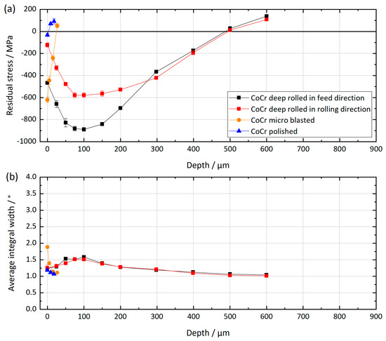 Figure 4 shows the depth distributions of RSs and mean integral widths for the CoCrMo samples. The courses show similarities to the ones of the Ti6Al4V samples. The polished sample is almost unaffected by the surface treatment, it shows only a small amount of tensile residual stresses close to the surface. Deep rolling and microblasting on the other hand induced characteristic compressive residual stress distributions. Microblasting resulted in compressive RSs of approximately −600 MPa directly at the surface. In addition, a steep gradient with a zero crossing and a change of sign towards tensile RSs in a depth of about 30 µm was found. As for the Ti6Al4V samples, the RSs are higher in the feed direction than in the rolling direction. Directly at the surface, compressive RSs in the feed direction of about −470 MPa and in the rolling direction of about −120 MPa were determined. At a depth of approximately 100 µm, the maximum of the compressive RSs reached about −900 MPa in the feed direction and about –580 MPa in the rolling direction. Zero crossing is observed at a depth of about 500 µm. At depths of more than 500 µm, tensile RSs were determined.