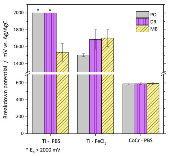Generally, Ti6Al4V showed higher breakdown potentials than CoCrMo, meaning that Ti has a higher resistance to pitting corrosion. At polished and deep-rolled samples, breakdown of the passive layer could not be accomplished in PBS up to a potential of 2000 mV. This is consistent with the literature reporting breakdown potentials between 2500 and 3500 mV for Ti6Al4V in chloride-containing electrolytes [28,29]. The microblasted sample, on the other hand, exhibited a clearly lower breakdown potential of 1536 mV in PBS, which indicates a greater susceptibility to pitting corrosion of microblasted surfaces in comparison to polished or deep-rolled surfaces. Polarization of Ti samples in the FeCl3-containing electrolyte led to breakdown of the passive layer for all tested surface conditions well below 2000 mV, while in this corrosion-accelerating electrolyte, the polished samples exhibited passive layer breakdown at lower potential than microblasted and deep-rolled samples. Interestingly, the addition of FeCl3 only resulted in decreased breakdown potentials for PO and DR surfaces, the breakdown potential of the microblasted surface was not further lowered by the FeCl3-containing environment.