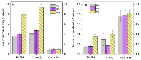 Passive current densities of polished, deep-rolled and microblasted Ti6Al4V samples tested in PBS and in FeCl3 and of polished, deep-rolled and microblasted CoCrMo samples tested in PBS. (a) Passive currents from the first anodic polarization cycle. (b) Passive currents from polarization cycles no. 2–4.