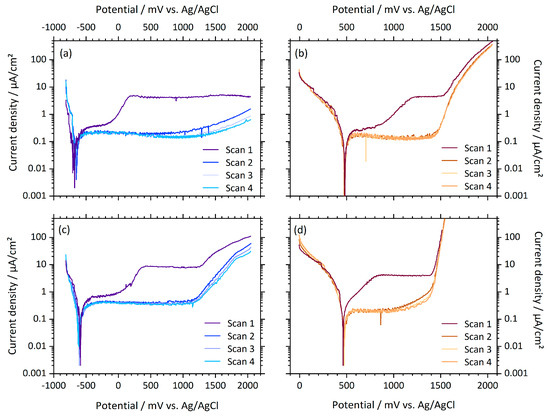 The anodic current density–potential plots shown in Figure 7 illustrate the distinct first polarization cycle of Ti samples. The passive region subdivides in two parts of a less distinct plateau at passive current densities in the range of several hundred nA, and a second, more pronounced plateau in the µA range. In scans no. 2–4, a stable plateau region at the lower passive current densities developed. The FeCl3-containing electrolyte resulted further in a displacement of the corrosion potential (i.e., the potential at zero crossing of the current density, which refers to the minimal value in logarithmic representation), from about −600 to about 500 mV (cp. Table 3), which means that the cathodic reaction is enhanced if FeCl3-containing electrolyte is used.