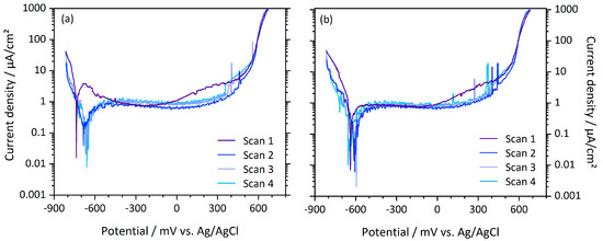 For CoCr discs, again the curve progression in the first polarization cycle differs from the following cycles, as illustrated for a polished and a microblasted CoCr sample, respectively, in Figure 8. For polished and deep-rolled samples, during the first cycle, a passivation peak at approximately −700 mV can be noticed (cp. Figure 8a). After reaching the local maximum, the current density lowers to the passive current densities displayed in Table 2. With further increasing potential starting at approximately 0 mV, the passive current rised again slowly to a shoulder before the breakdown potential—characterized by the abruptly rising current density—is reached. This progression was observed for all mechanical surface treatments.