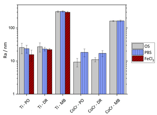 Ra values (nm) for Ti6Al4V and CoCrMo in polished, deep-rolled and microblasted surface condition. “Original surface” (OS) refers to the region which had not been in contact with the electrolyte during electrochemical testing; PBS refers to the surface after being electrochemically tested in PBS; FeCl3 refers to the surface after being electrochemically tested in FeCl3-containing electrolyte.