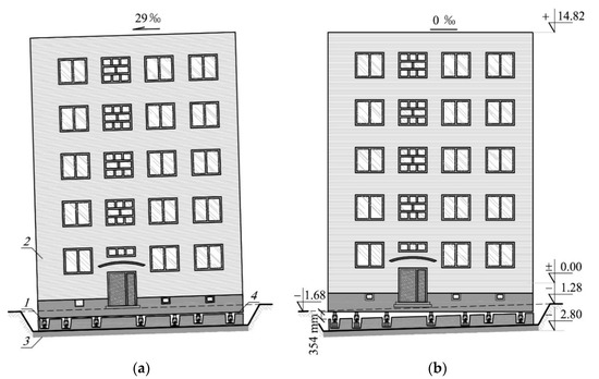 Façade of the building the tilt of which was removed: (a) jacks installed in the building walls, (b) the building after uneven lifting; 1—temporary support, 2—unevenly lifted part of the building, 3—part of the building remaining in the ground, 4—detachment plane of the building.