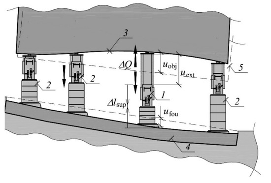 Change in the length of the active support and displacements of building elements in the place of its installation: 1—active support, 2—passive support, 3—unevenly lifted part of the building, 4—part of the building remaining in the ground, 5—original position of the part of the building, uext—forced extension of the active support piston, uobj—displacement of the lifted part of the building, ufou—displacement of the unlifted part, Δlsup—change in the length of the support, ΔQ—change in the value of force in the support.