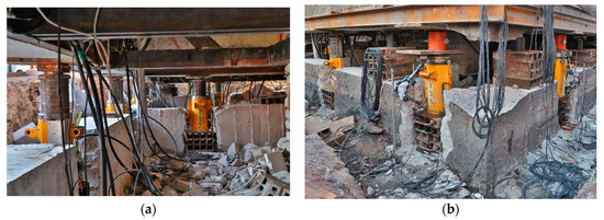 Piston extension, displacements, and length changes were measured using LVDT transducers. The measurement error, resulting from the non-linearity of the transducer, was up to 0.5%. The building resting on the jacks at the time of measurement is shown in Figure 7a, and support no. 29 during the investigations is shown in Figure 7b.