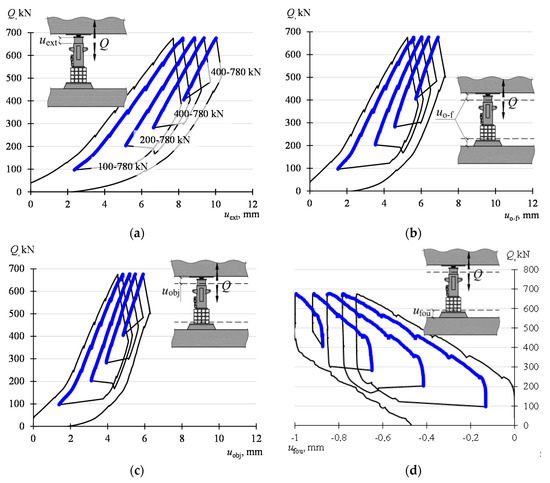 The dependencies Q−ufou were provided in Figure 8d. It can be seen that the increase in the value of the force Q is accompanied by the settlement of the foundation under the jack. In the beginning, when increasing the load, the displacements ufou are small. Then, a further increase in the value Q is accompanied by a more significant increase in the displacements ufou. The remark applies to each load cycle Qmin–Qmax.