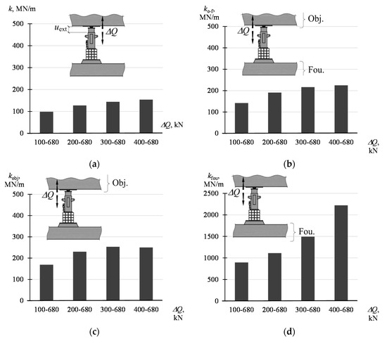 Stiffness of the system and its elements corresponding to the change ΔQ in the range of Qmin–Qmax: (a) k acc. to (4), (b) ko-f acc. to (7), (c) kobj acc. to (5), (d) kfou acc. to (6).