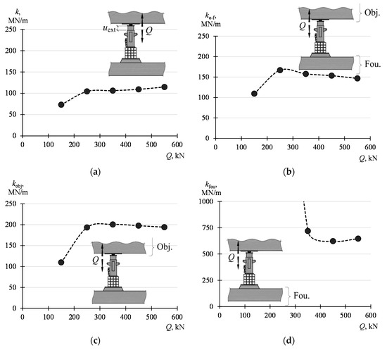 Figure 14a summarizes the stiffness of the system (k), building structure elements (kfou, kobj) and supports (ksup) corresponding to the ranges ΔQ. The relationship between these stiffnesses results from Equations (4)–(6) and (8) and from the fact that the displacement uext, corresponding to the stiffness of the whole system, is equal to the sum of displacements of the part remaining in the ground (ufou), the lifted part (uobj) and the change in the length of the support (Δlsup)—Equation (1). Hence, the stiffness k results from the serial combination of the stiffness kfou, kobj, and ksup, thus