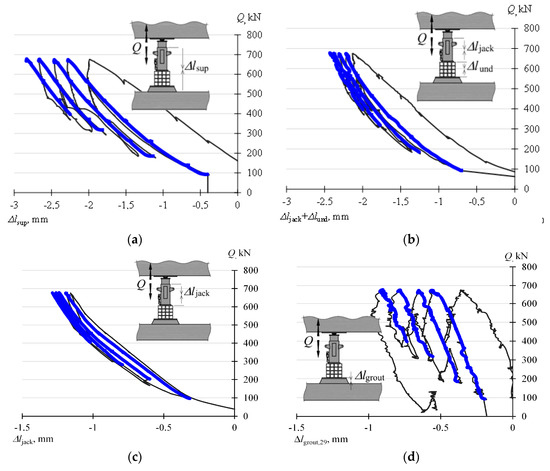 Figure 11c shows the change of the jack length (Δljack) under the influence of the increasing load Q. The change Δljack, obviously, is smaller than the changes shown in Figure 11b. The measured change of the jack length, corresponding to a change in the force Q in the range of 100 kN to 780 kN, is 0.912 mm. Such a significant change in the jack length derives from the fact that it is the result of both the deformations of the cylinder material as well as the deformations occurring at the contact between the sheet metal fixed in the concrete grout and the jack base. In turn, Figure 11d shows a diagram describing the shortening of the concrete grout (Δlgrout) under the influence of the load. The value (Δlgrout) was not the subject of direct measurement, but it was determined from the dependency (3).