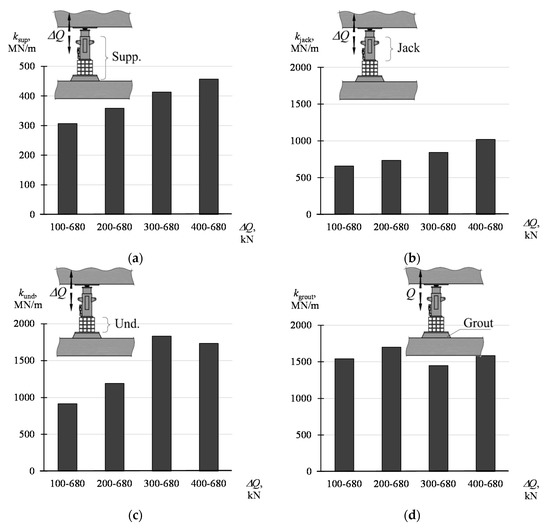 The stiffnesses of the support and its elements determined according to (8) and (9) were compiled in Table 3 and presented graphically in diagrams from Figure 12. The values of the parameters defined by the dependencies (8) and (9) are not constant and depend on the force amplitude (ΔQ = Qmax − Qmin). With the increase of the value Qmin, with constant Qmax equal to 680 kN, higher values of the parameters were obtained. The smallest values, from 307 MN/m to 457 MN/m, are assumed by ksup. On the other hand, the highest values are assumed by the stiffness kgrout and kund; from 1541 MN/m to 1700 MN/m and from 916 MN/m to 1832 MN/m, respectively. The stiffness kjack assumes the value from 658 MN/m to 1020 MN/m.